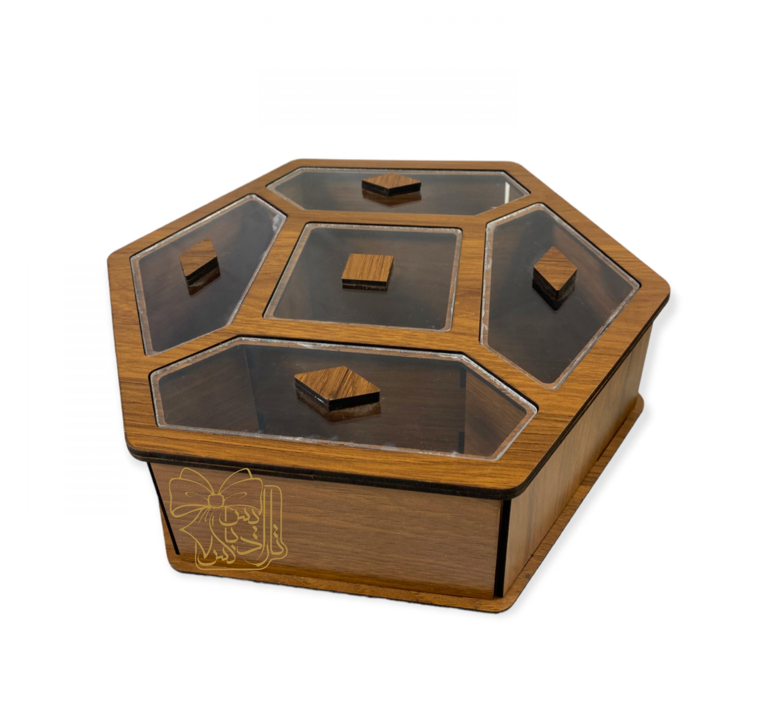 جعبه پذیرایی ماهرخ از جنس MDF 3 میلیمتر تایلندی ساخته شده و دارای 5 محفظه مجزا درب دار برای نگهداری انواع دمنوش، آجیل، شیرینی، تنقلات، شکلات و … طراحی شده است.