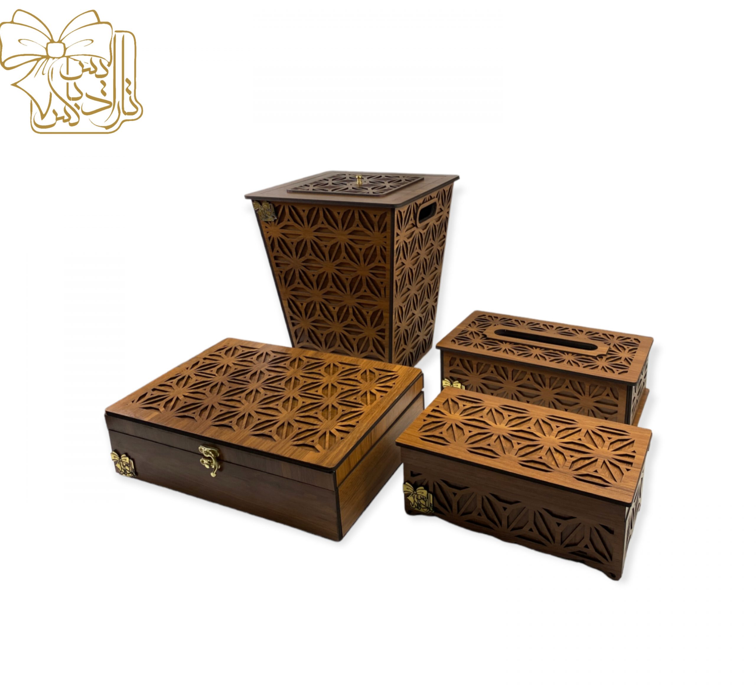 ست چوبی لوازم پذیرایی گلین، شامل جادستمال کاغذی، جا قاشقی، جعبه آجیل و خشکبار و سطل زباله مدل TSET-01